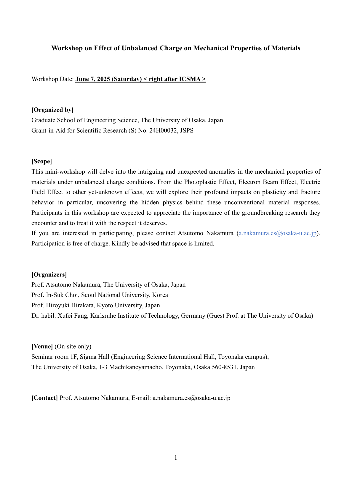 Atsutomo Nakamura, Organizer 2025.6.7 The Effect of Unbalanced Charge on the Mechanical Properties of Materials Toyonaka Campus, The University of Osaka, Japan