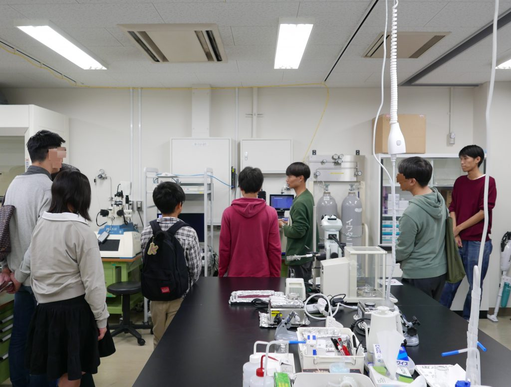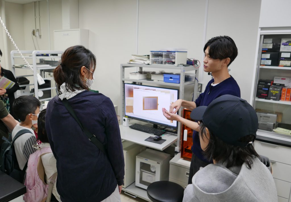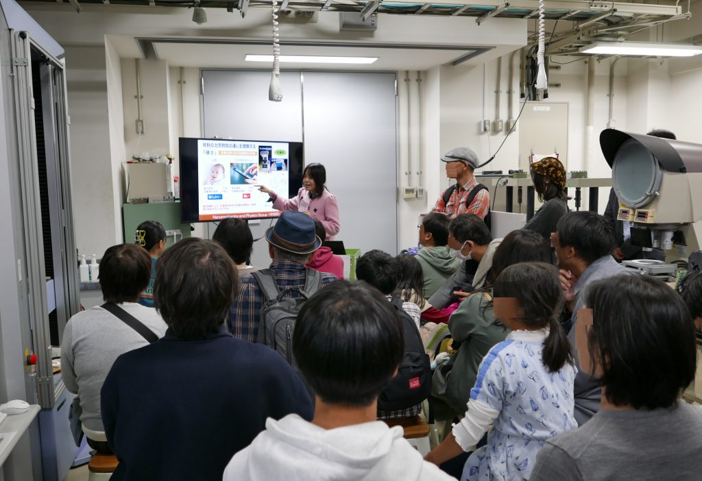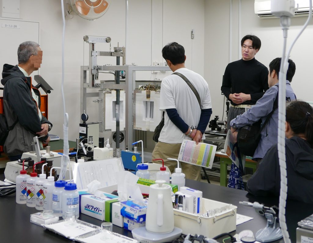 2025年11月1日、阪大まちかね祭に「光で硬さが変化する結晶の話:半導体の光力学特性」というテーマで基礎工学研究科企画に参加しました。当日はテーマをもとに、「先生の講話 ・実験室紹介・実験実演」の内容で研究室公開を行いました。学生の方や親子連れ、地域の方や遠方から来校された方々と、3回に分けての研究室公開でしたが、多くの方がご参加くださり、中村研の学生とともに和やかな雰囲気のなか企画を行うことができました。