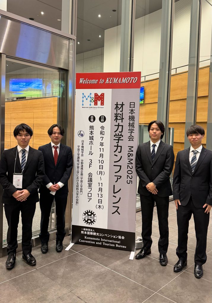 2025年11月10日~13日に、熊本市 熊本城ホールにて開催された「日本機械学会 M&M2025 材料力学カンファレンス」に、中村教授およびM2の松原さん、平岡さん、岸本さん、高原さんが参加しました。松原さん、平岡さん、岸本さん、高原さんは、それぞれ「ナノ力学 -ナノの視点で次世代の材料力学を創成」セッションにおいて研究発表を行いました。